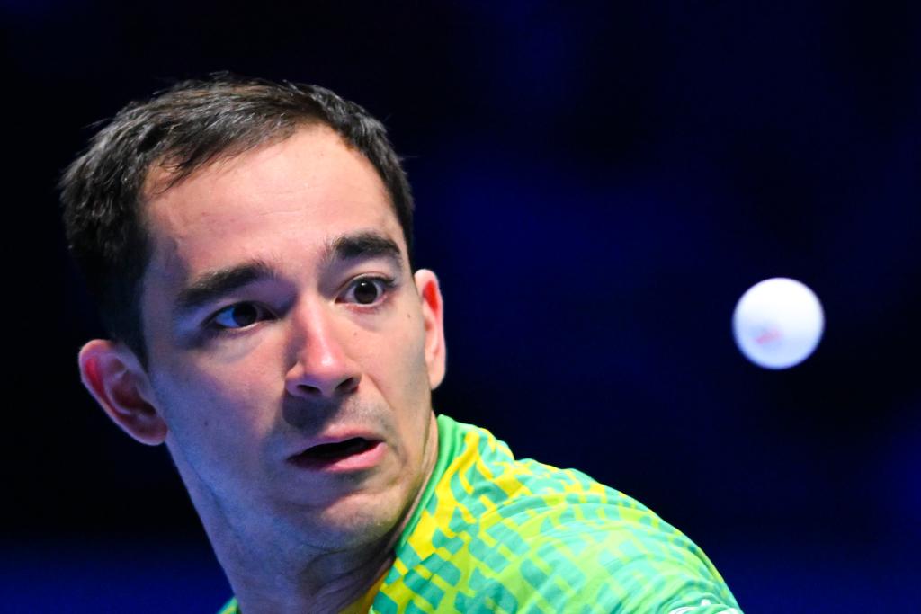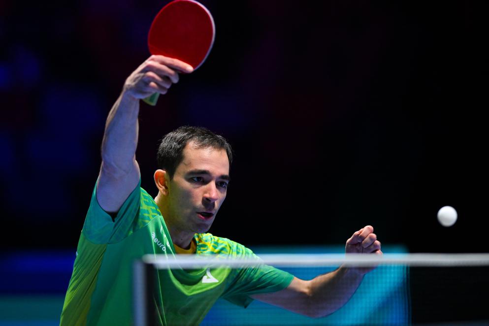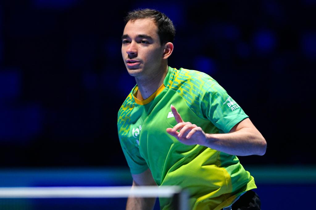 Hugo Calderano competes during the men's singles group 3 match between Hugo Calderano of Brazil and Lubomir Jancarik of the Czech Republic at the ITTF Men's and Women's World Cup 2026 in Macao, China, March 31, 2026. (Xinhua/Cheong Kam Ka)