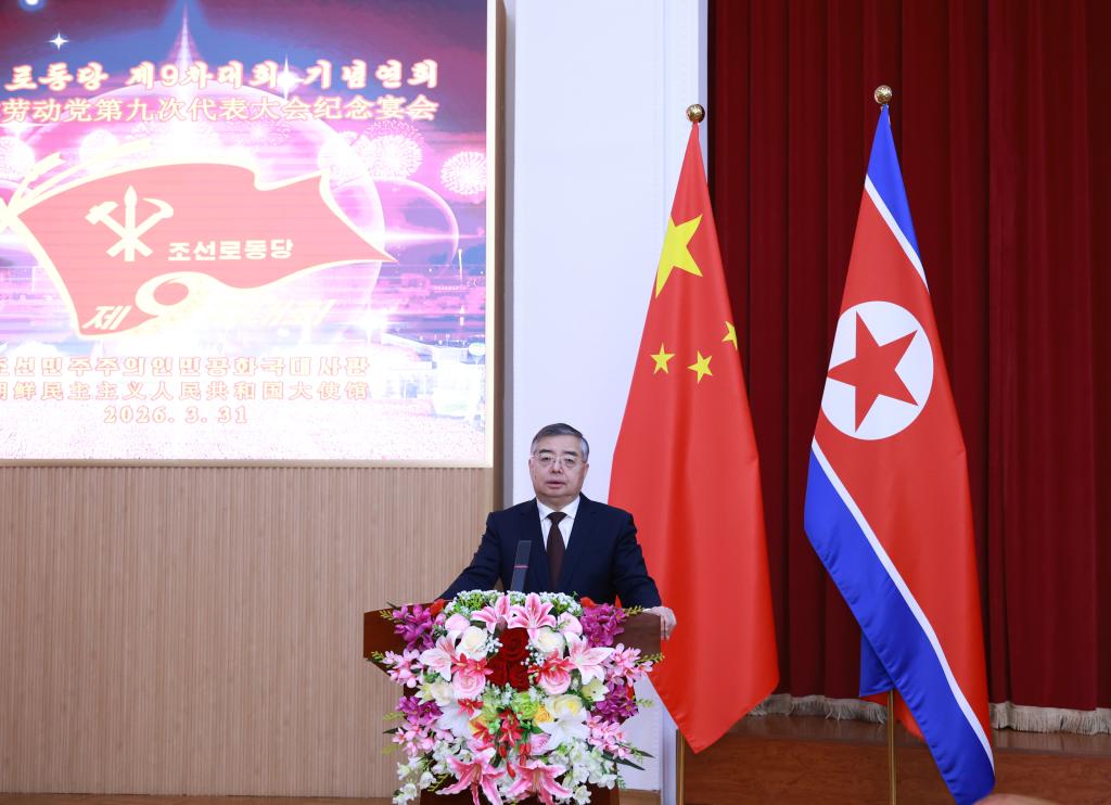 Li Shulei, a member of the Political Bureau of the Communist Party of China (CPC) Central Committee and head of the Publicity Department of the CPC Central Committee, attends a reception celebrating the Ninth Congress of the Workers' Party of Korea (WPK) of the Democratic People's Republic of Korea (DPRK) held by the embassy of the DPRK in China, in Beijing, capital of China, March 31, 2026. (Xinhua/Wang Ye)