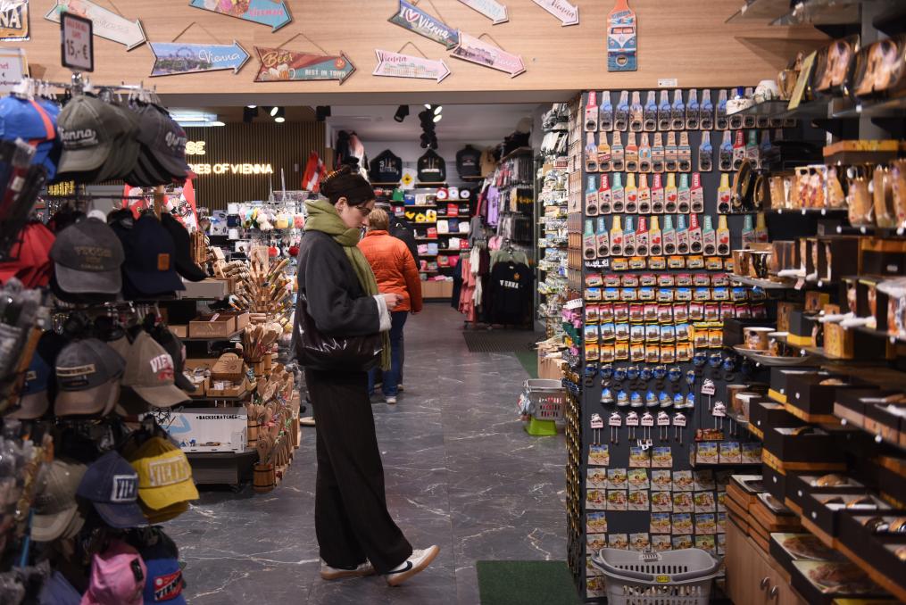 A woman chooses goods at a souvenir shop in Vienna, Austria, March 31, 2026. (Xinhua/He Canling)
