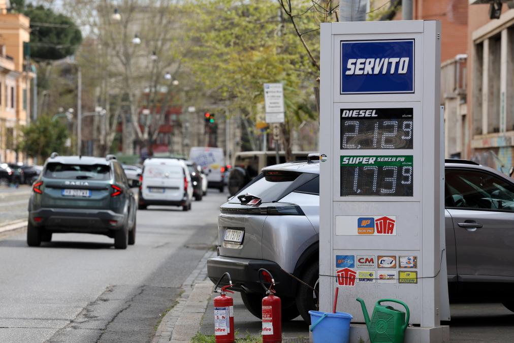 Photo taken on March 31, 2026 shows a price board of a gas station in Rome, Italy. (Xinhua/Li Jing)