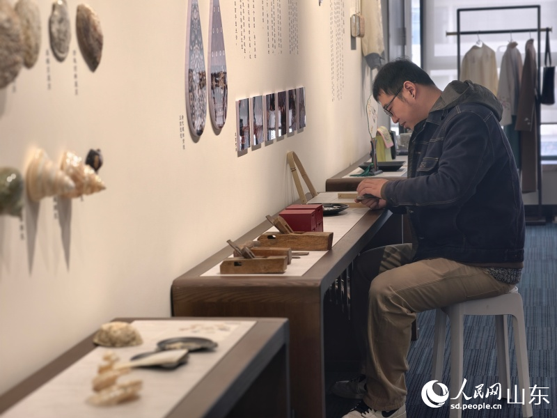 Han Hui, a fourth-generation inheritor of Qingdao's intangible cultural heritage of Luodian, processes raw shell materials in Qingdao, east China's Shandong Province. (People's Daily Online/Liu Yingjie)
