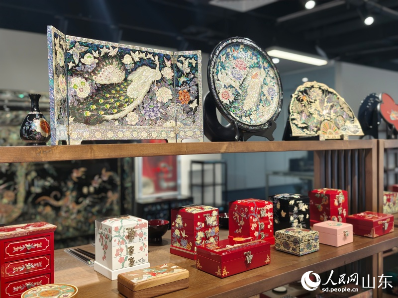 Visitors experience the craft of Luodian, also known as mother-of-pearl inlay, in a workshop in the West Coast New Area of Qingdao, east China's Shandong Province. (People's Daily Online/Liu Yingjie)