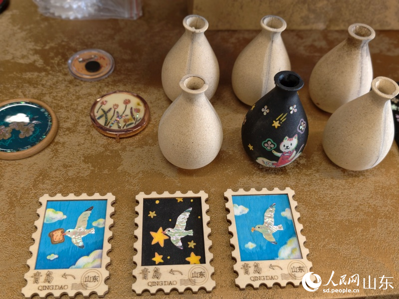 Inside the workshop, visitors can view an assortment of Luodian works, from refrigerator magnets featuring Qingdao landmarks to tea trays and jewelry boxes that blend practicality with artistry.