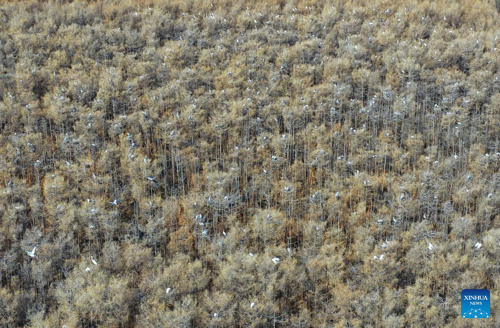 An aerial drone photo taken on April 1, 2026 shows herons resting on trees in Tongjiang, northeast China's Heilongjiang Province. (Photo by Liu Wanping/Xinhua)