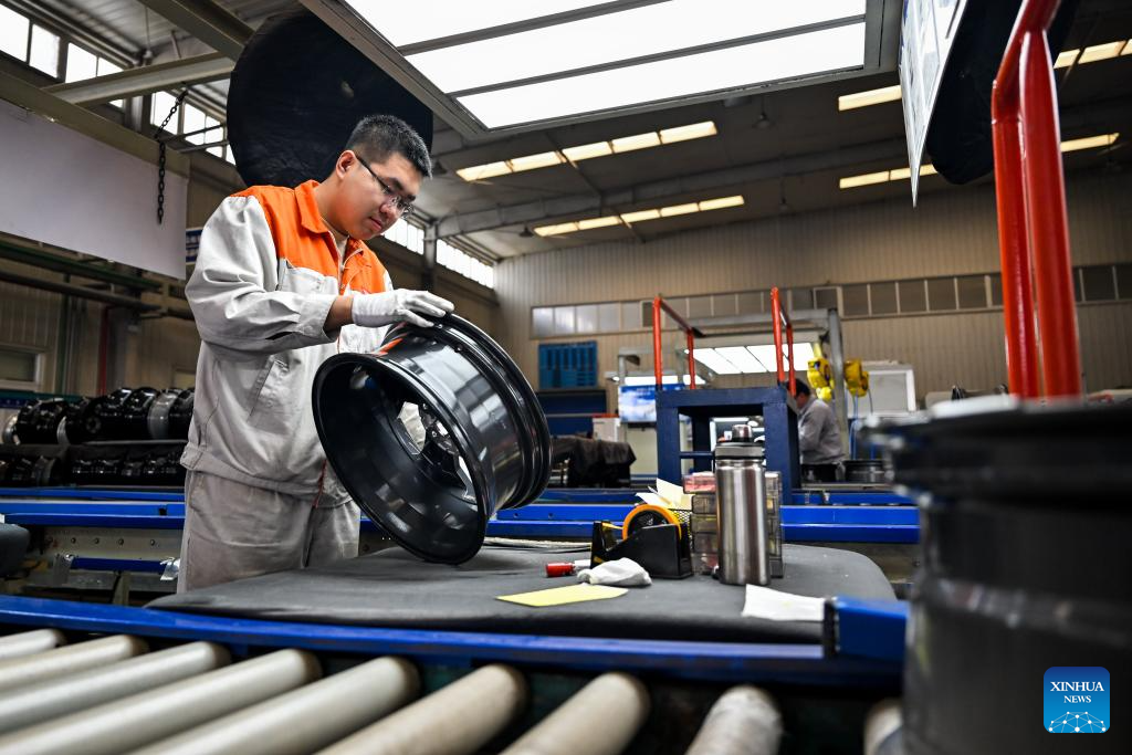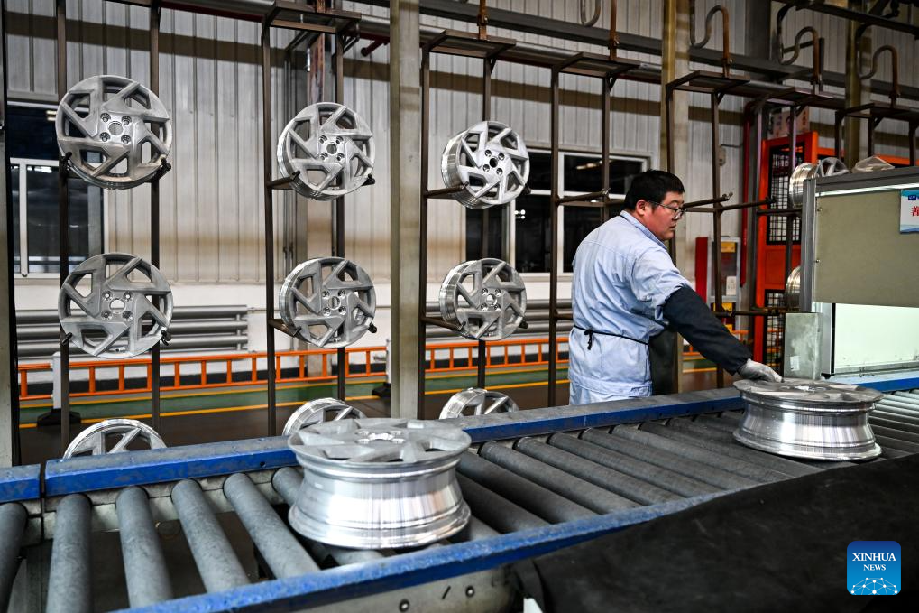 A worker works at an aluminium alloy wheel hubs production line of an auto parts manufacturing company in Baotou, north China's Inner Mongolia Autonomous Region, April 1, 2026. In recent years, Baotou City has been accelerating the green and low-carbon development of the aluminium industry while extending the industrial chain, focusing on high-value-added products and creating an industrial cluster to promote local economic development. (Xinhua/Li Zhipeng)