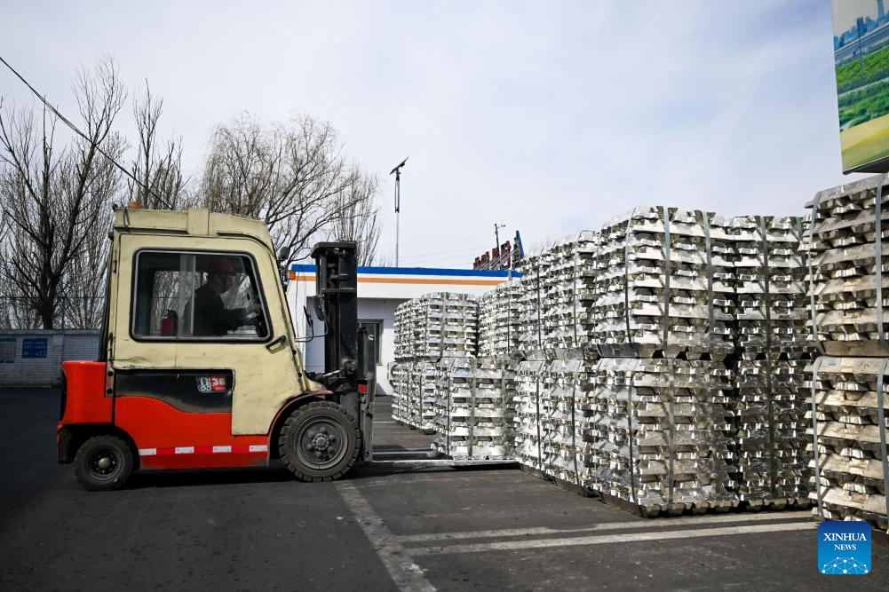 A worker drives a forklift to transfer aluminium ingots at an aluminium company in Baotou, north China's Inner Mongolia Autonomous Region, April 1, 2026. In recent years, Baotou City has been accelerating the green and low-carbon development of the aluminium industry while extending the industrial chain, focusing on high-value-added products and creating an industrial cluster to promote local economic development. (Xinhua/Li Zhipeng)