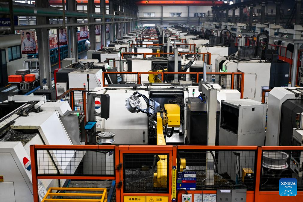 This photo taken on April 1, 2026 shows an aluminium alloy wheel hubs production line of an auto parts manufacturing company in Baotou, north China's Inner Mongolia Autonomous Region. In recent years, Baotou City has been accelerating the green and low-carbon development of the aluminium industry while extending the industrial chain, focusing on high-value-added products and creating an industrial cluster to promote local economic development. (Xinhua/Li Zhipeng)