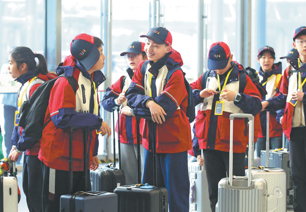 Students board a high-speed train in Changzhou, Jiangsu, on Wednesday, as they embark on an outbound trip. CHEN WEI/FOR CHINA DAILY