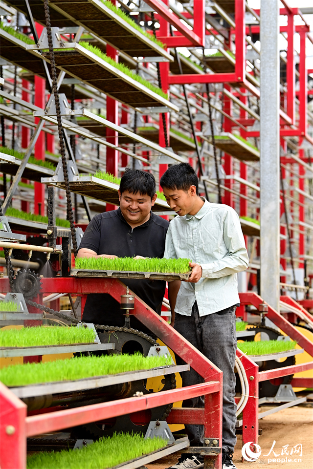 Tech-savvy farmers calibrate multi-layered vertical racks that can rotate 360 degrees at a rice seedling factory in Hengshi town, Nankang district, Ganzhou, east China's Jiangxi Province. (People's Daily Online/Zhu Haipeng)