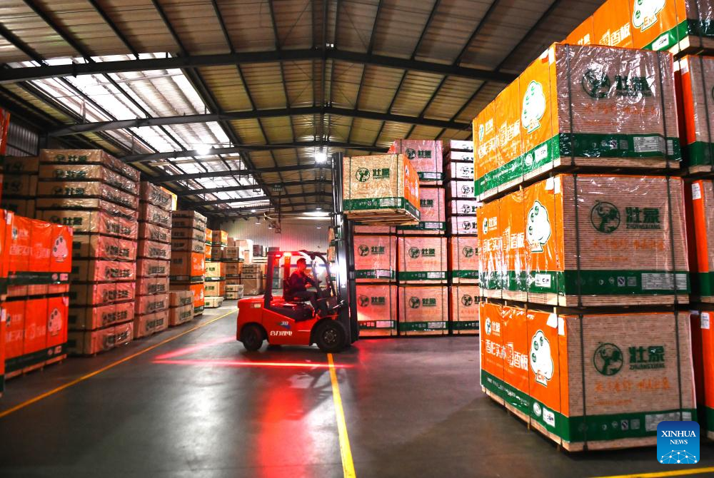 A worker works at a board production factory in Rong'an County of Liuzhou City, south China's Guangxi Zhuang Autonomous Region, April 1, 2026. In recent years, Rong'an County has leveraged its high-quality resources of Chinese fir to drive rural revitalization. Through integrating seedling cultivation, planting, timber processing and rural tourism, the Chinese fir-related industry has emerged as a pillar sector in Rong'an, creating more than 20,000 jobs for local residents. (Xinhua/Huang Xiaobang)