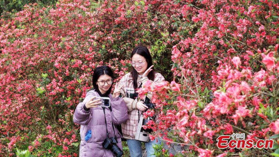 Tourists take photos in the azalea flowers in the Tongyong Village of Chetian Village, Sanjiang Dong Autonomous County, Guangxi Zhuang Autonomous Region, March 27, 2026. (Photo/China News Service)