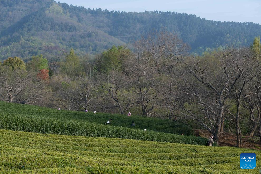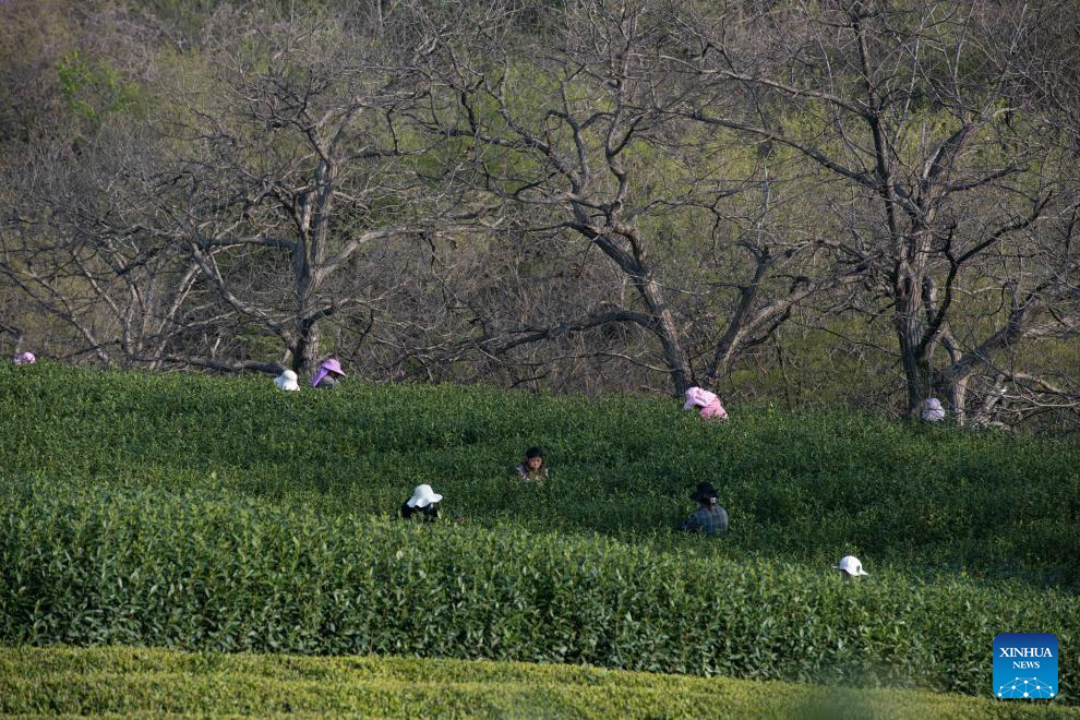 Workers pick tea leaves at the foot of Jingting Mountain in Xuancheng City, east China's Anhui Province, April 2, 2026. Jingting Mountain, celebrated by Li Bai, a legendary Chinese poet of Tang Dynasty (618-907), has long been renowned for its poetic charm. As a core production area of green tea, the mountain is surrounded by more than 10,000 mu (about 666.67 hectares) of tea gardens. In recent years, local authorities have leveraged Jingting Mountain's unique natural resources and cultural heritage to deeply integrate tea cultivation with tourism. Now, many tourists come to experience the delightful blend of tea aroma and poetic landscapes as the tea-harvesting season here has begun. (Xinhua/Zhang Duan)