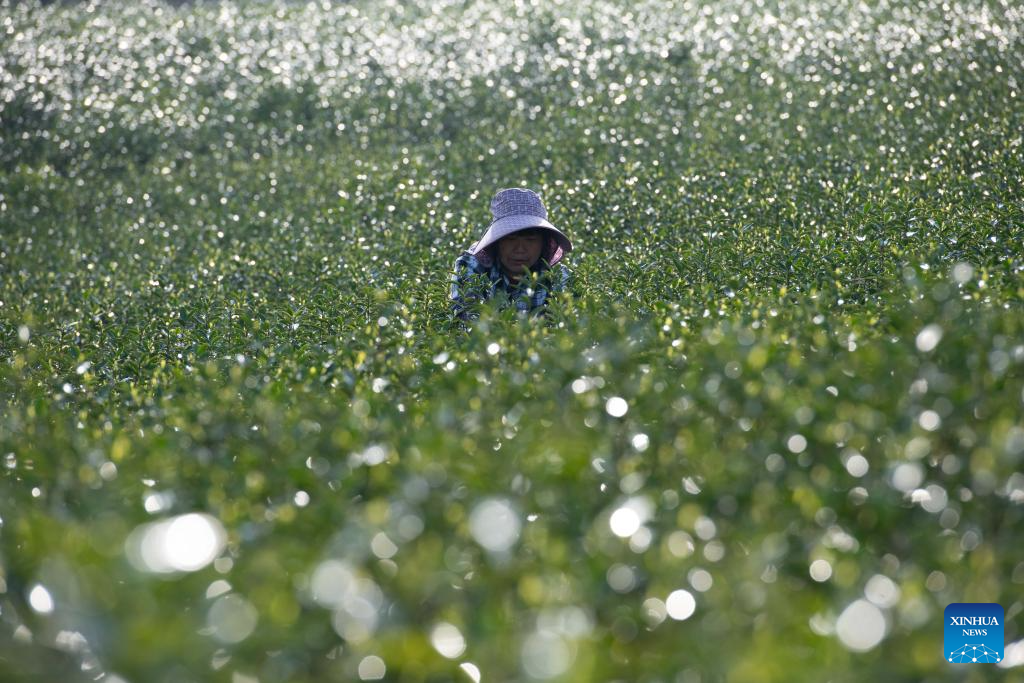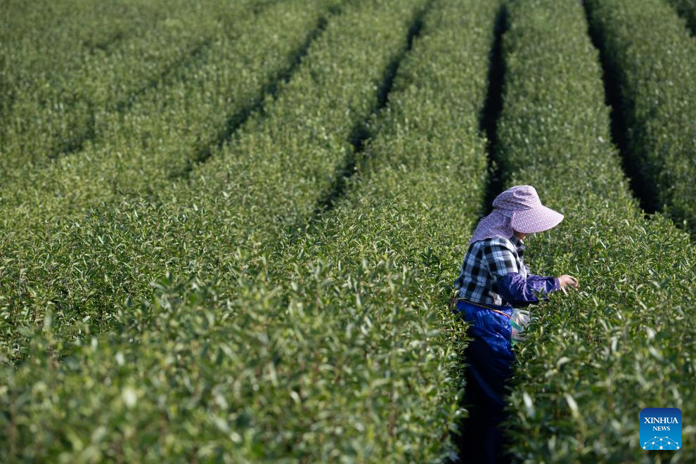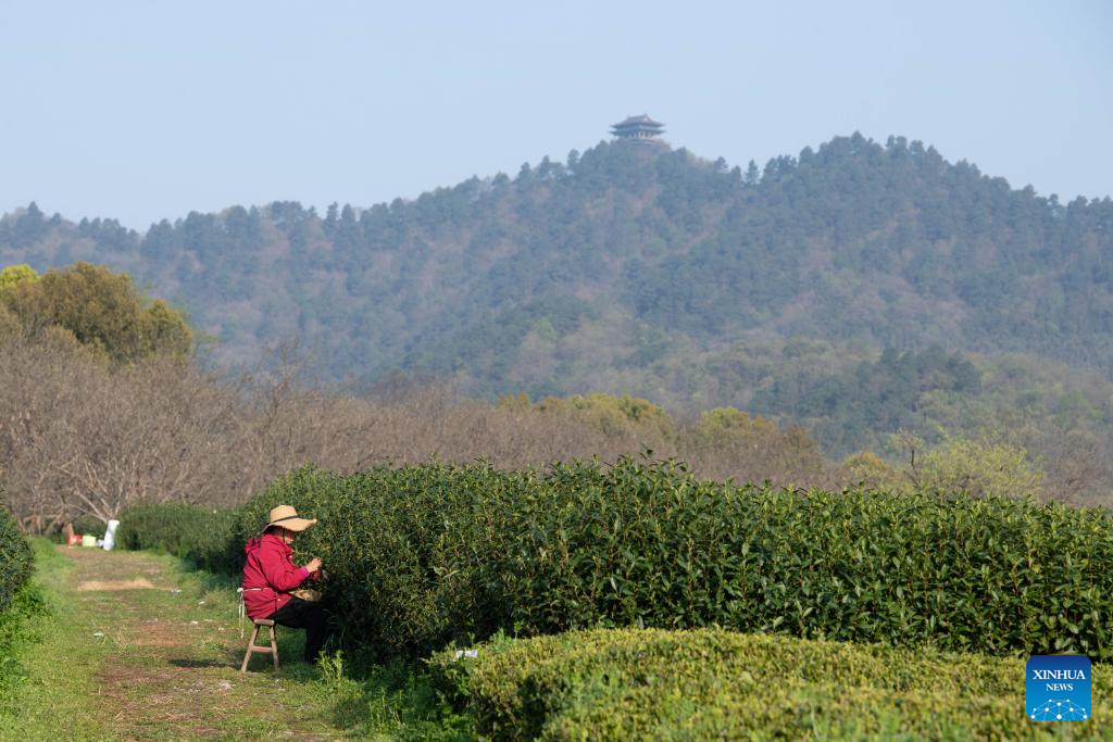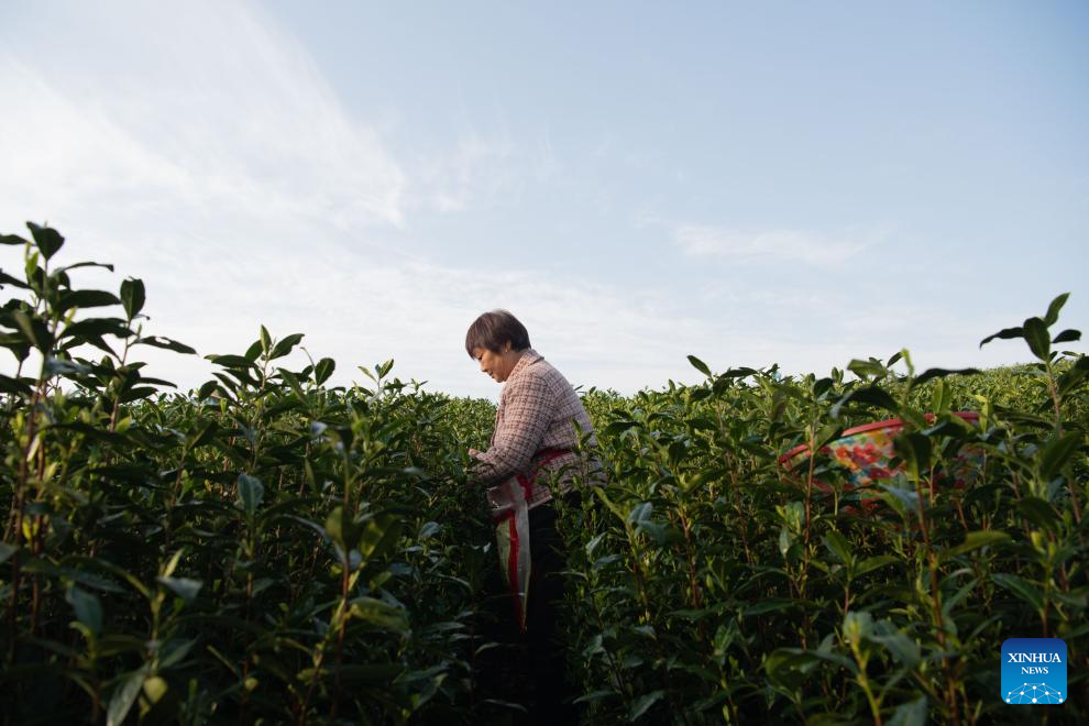 A worker picks tea leaves at the foot of Jingting Mountain in Xuancheng City, east China's Anhui Province, April 2, 2026. Jingting Mountain, celebrated by Li Bai, a legendary Chinese poet of Tang Dynasty (618-907), has long been renowned for its poetic charm. As a core production area of green tea, the mountain is surrounded by more than 10,000 mu (about 666.67 hectares) of tea gardens. In recent years, local authorities have leveraged Jingting Mountain's unique natural resources and cultural heritage to deeply integrate tea cultivation with tourism. Now, many tourists come to experience the delightful blend of tea aroma and poetic landscapes as the tea-harvesting season here has begun. (Xinhua/Zhang Duan)