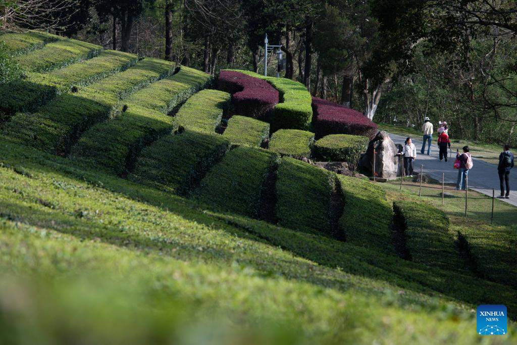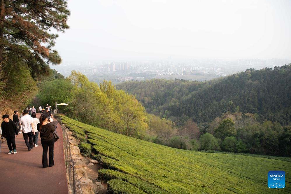 Tourists walk past a tea garden at Jingting Mountain national forest park in Xuancheng City, east China's Anhui Province, April 1, 2026. Jingting Mountain, celebrated by Li Bai, a legendary Chinese poet of Tang Dynasty (618-907), has long been renowned for its poetic charm. As a core production area of green tea, the mountain is surrounded by more than 10,000 mu (about 666.67 hectares) of tea gardens. In recent years, local authorities have leveraged Jingting Mountain's unique natural resources and cultural heritage to deeply integrate tea cultivation with tourism. Now, many tourists come to experience the delightful blend of tea aroma and poetic landscapes as the tea-harvesting season here has begun. (Xinhua/Zhang Duan)