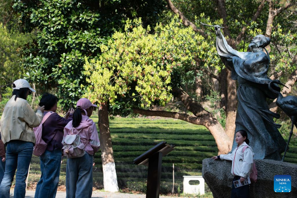 A tourist poses for photos with the statue of Chinese poet Li Bai at Jingting Mountain national forest park in Xuancheng City, east China's Anhui Province, April 2, 2026. Jingting Mountain, celebrated by Li Bai, a legendary Chinese poet of Tang Dynasty (618-907), has long been renowned for its poetic charm. As a core production area of green tea, the mountain is surrounded by more than 10,000 mu (about 666.67 hectares) of tea gardens. In recent years, local authorities have leveraged Jingting Mountain's unique natural resources and cultural heritage to deeply integrate tea cultivation with tourism. Now, many tourists come to experience the delightful blend of tea aroma and poetic landscapes as the tea-harvesting season here has begun. (Xinhua/Zhang Duan)