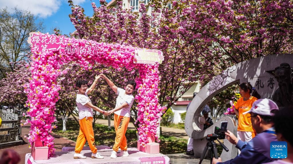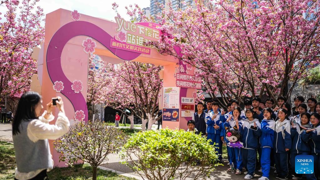 People pose for photos under cherry blossoms along the Shuicheng River in Liupanshui, southwest China's Guizhou Province, April 3, 2026. The cherry blossoms along the Shuicheng River in Liupanshui are in full bloom, attracting people for spring outings. In recent years, the city has leveraged its riverside cherry blossoms to expand the flower-viewing industry, unlocking market consumption potential with its natural landscapes. (Xinhua/Tao Liang)