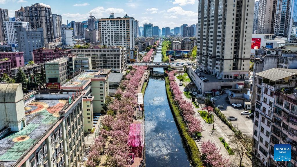 An aerial drone photo taken on April 3, 2026 shows the cherry blossoms along the Shuicheng River in Liupanshui, southwest China's Guizhou Province. The cherry blossoms along the Shuicheng River in Liupanshui are in full bloom, attracting people for spring outings. In recent years, the city has leveraged its riverside cherry blossoms to expand the flower-viewing industry, unlocking market consumption potential with its natural landscapes. (Xinhua/Tao Liang)