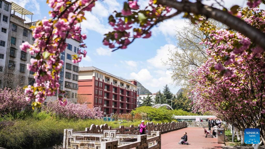 People enjoy their leisure time under cherry blossoms along the Shuicheng River in Liupanshui, southwest China's Guizhou Province, April 3, 2026. The cherry blossoms along the Shuicheng River in Liupanshui are in full bloom, attracting people for spring outings. In recent years, the city has leveraged its riverside cherry blossoms to expand the flower-viewing industry, unlocking market consumption potential with its natural landscapes. (Xinhua/Tao Liang)