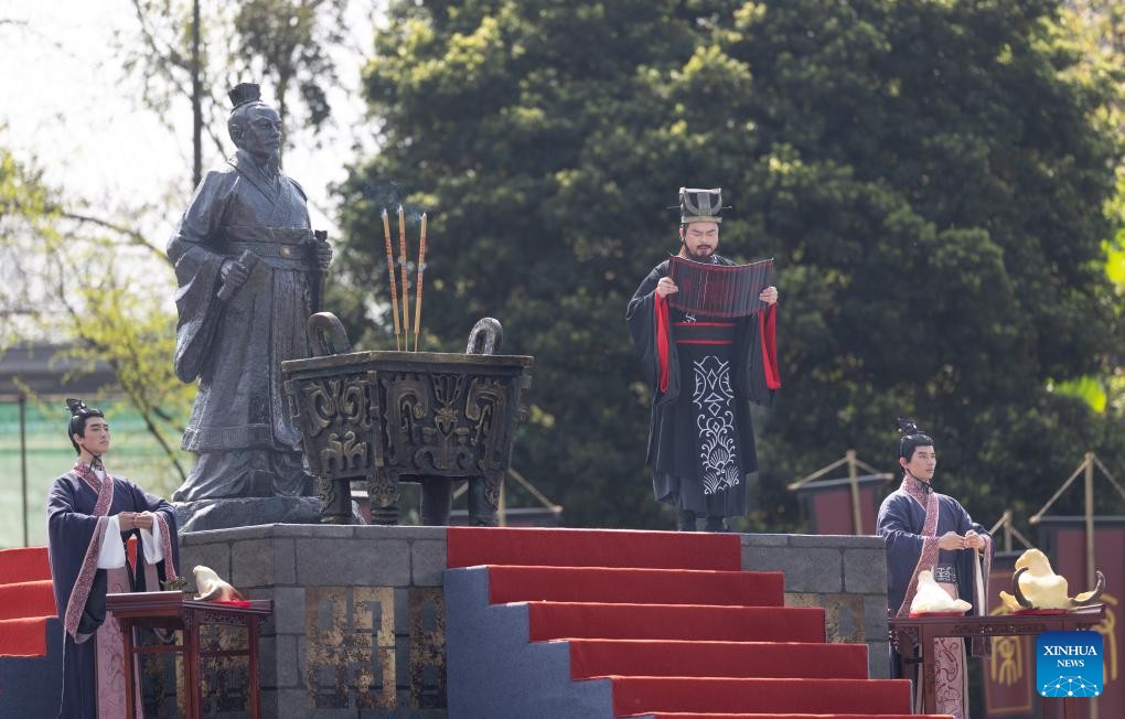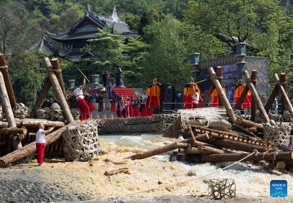 People attend a ritual during a water releasing festival held in Dujiangyan, southwest China's Sichuan Province, April 3, 2026. The Dujiangyan water releasing festival was celebrated on Friday in Dujiangyan. People prayed for good harvests during the festival, a time-honored custom in western Sichuan Plain with important historical, cultural and folkloric values.