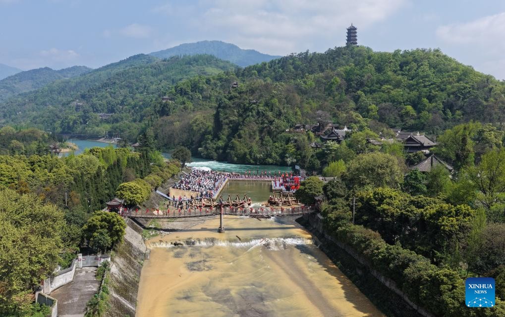 A drone photo taken on April 3, 2026 shows people taking part in a water releasing festival held in Dujiangyan, southwest China's Sichuan Province. The Dujiangyan water releasing festival was celebrated on Friday in Dujiangyan. People prayed for good harvests during the festival, a time-honored custom in western Sichuan Plain with important historical, cultural and folkloric values.