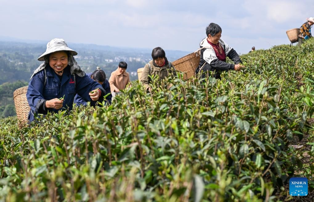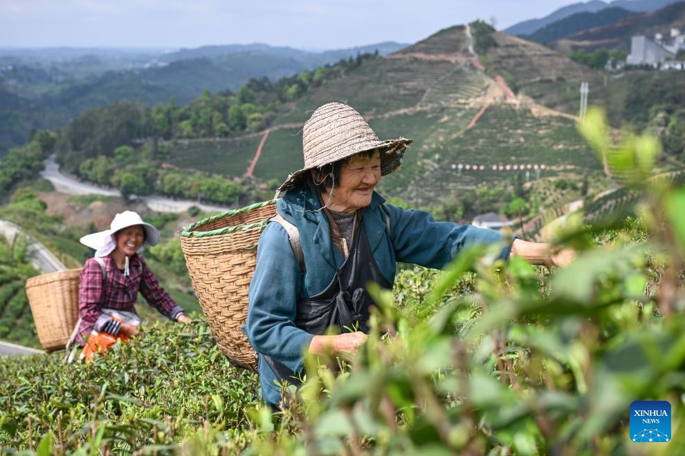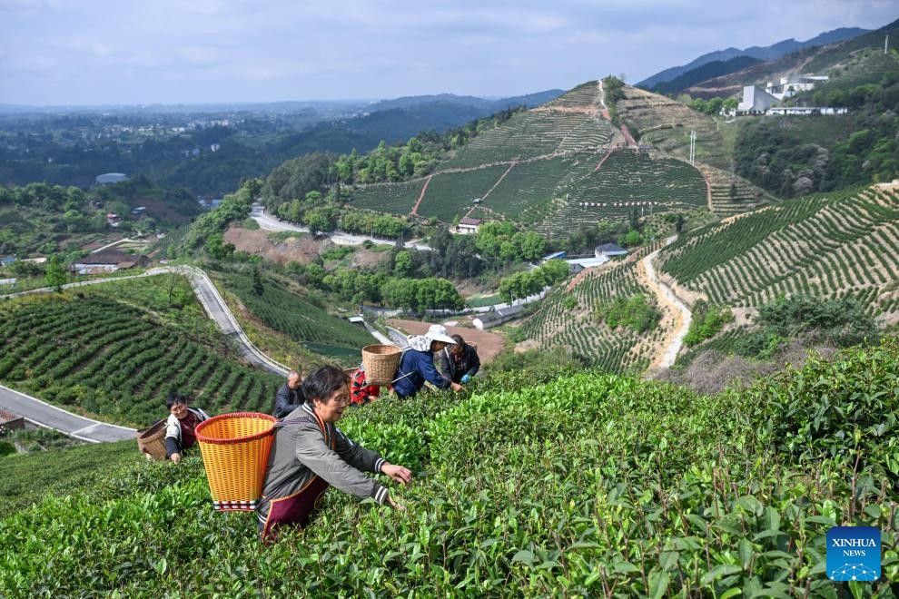 Farmers pick tea leaves at a tea garden in Baofeng Town, Yongchuan District of southwest China's Chongqing Municipality, April 3, 2026. Baofeng Town in Chongqing has vigorously developed its tea industry by leveraging local advantages in recent years, establishing tea gardens that stretch across the town and into the neighboring Pilu Town in Sichuan Province. It has also promoted rural tourism to boost employment and income for villagers. The two towns have become a model for cross-provincial coordinated development. (Xinhua/Chen Cheng)