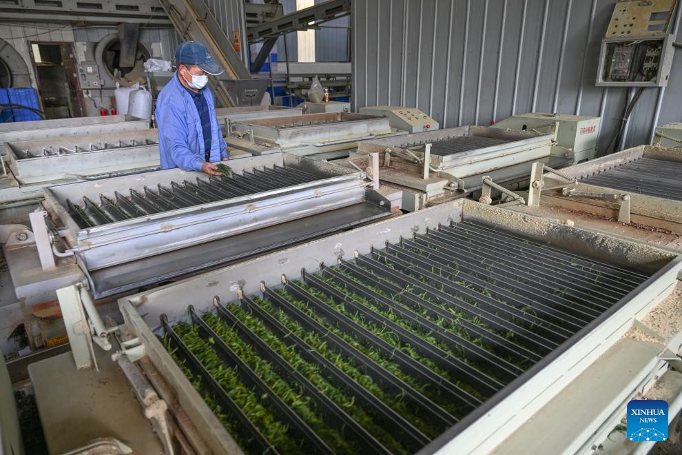 A worker processes tea leaves at a tea factory in Baofeng Town, Yongchuan District of southwest China's Chongqing Municipality, April 3, 2026. Baofeng Town in Chongqing has vigorously developed its tea industry by leveraging local advantages in recent years, establishing tea gardens that stretch across the town and into the neighboring Pilu Town in Sichuan Province. It has also promoted rural tourism to boost employment and income for villagers. The two towns have become a model for cross-provincial coordinated development. (Xinhua/Chen Cheng)