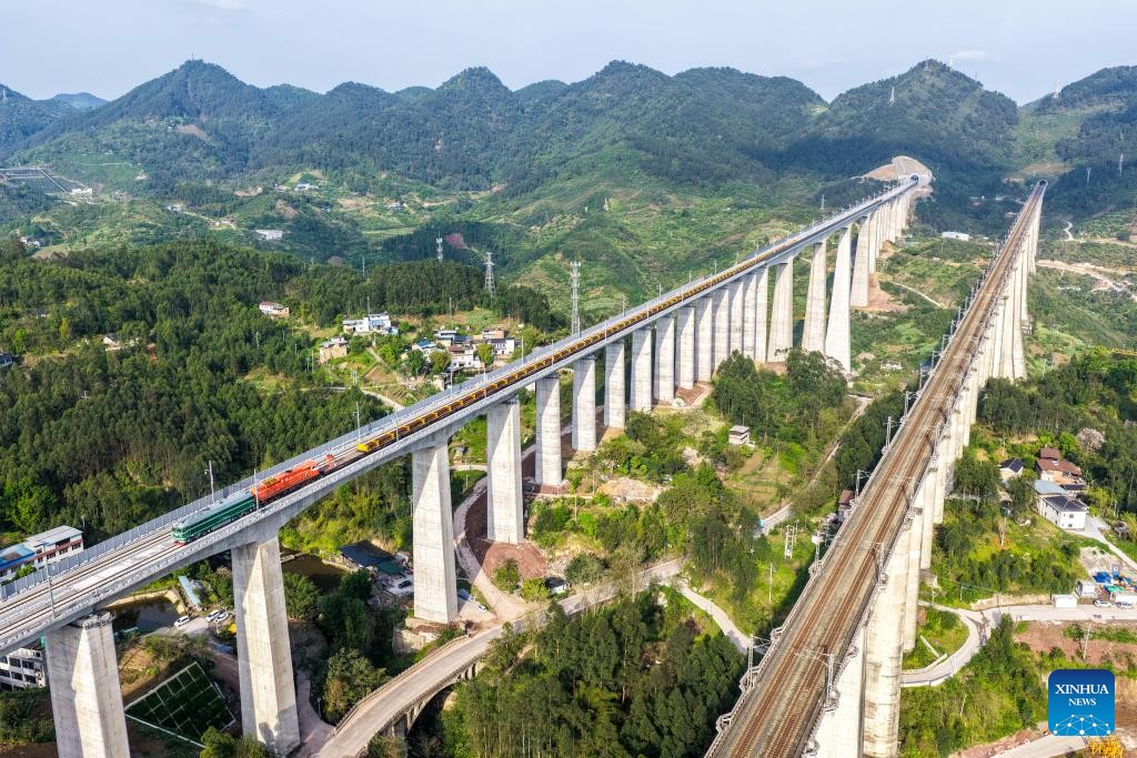 A drone photo taken on April 3, 2026 shows a construction site of the Chongqing-Wanzhou high-speed railway during its track-laying phase in southwest China's Chongqing Municipality. The construction of the Chongqing-Wanzhou high-speed railway entered the track-laying phase on Friday. With a designed speed of 350 kilometers per hour, the high-speed railway stretches 251 kilometers from Chongqing East Railway Station to Wanzhou North Railway Station. (Xinhua/Tang Yi)