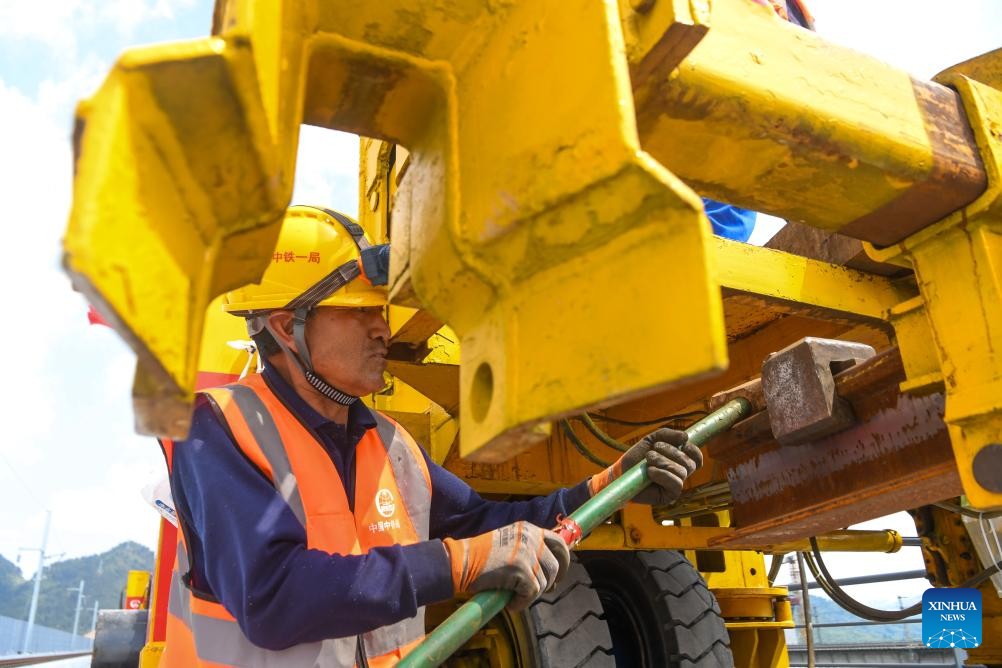 A worker carries out track-laying operations along the Chongqing-Wanzhou high-speed railway in southwest China's Chongqing Municipality, April 3, 2026. The construction of the Chongqing-Wanzhou high-speed railway entered the track-laying phase on Friday. With a designed speed of 350 kilometers per hour, the high-speed railway stretches 251 kilometers from Chongqing East Railway Station to Wanzhou North Railway Station. (Xinhua/Tang Yi)
