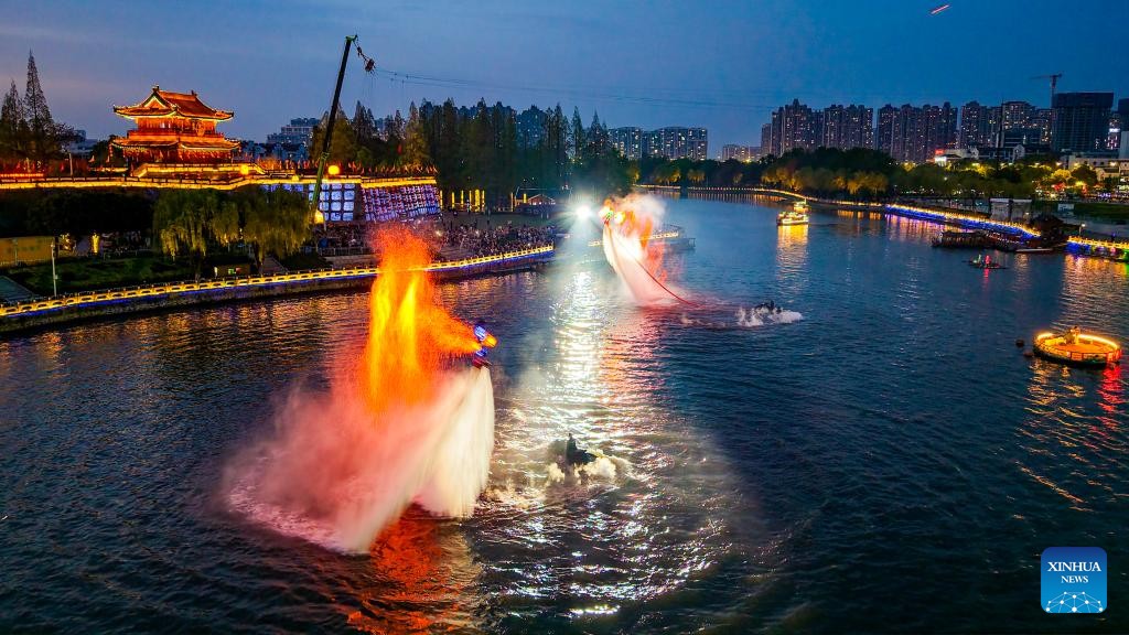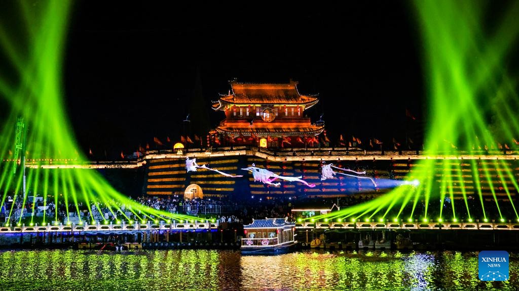 A performance is staged outside the Jingzhou ancient city in Jingzhou, central China's Hubei Province, April 3, 2026. The performance aiming at boosting spring cultural tourism was staged here on the evening of Friday, attracting lots of visitors. (Photo by Zhang Mengyao/Xinhua)