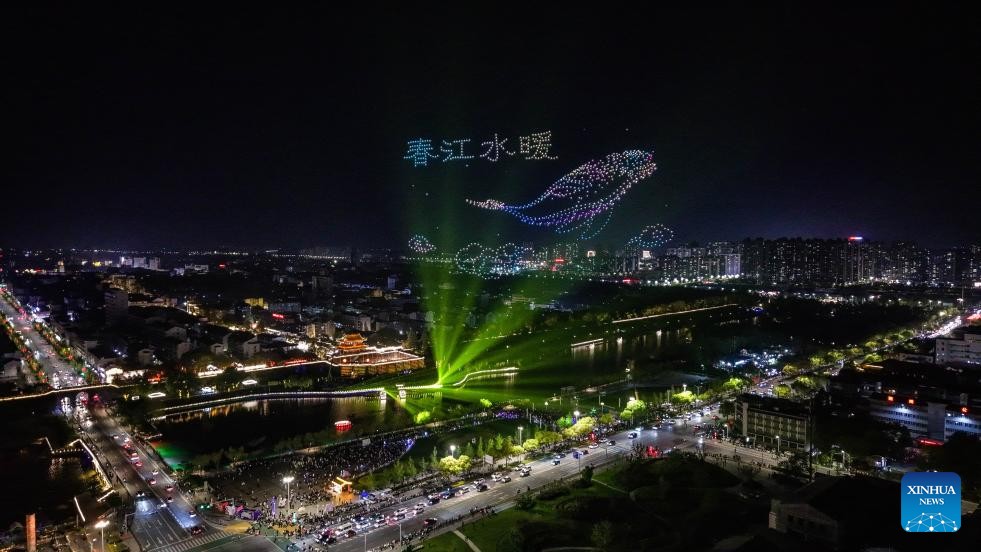 A drone show is held near the Jingzhou ancient city in Jingzhou, central China's Hubei Province, April 3, 2026. The performance aiming at boosting spring cultural tourism was staged here on the evening of Friday, attracting lots of visitors. (Photo by Wu Taotao/Xinhua)