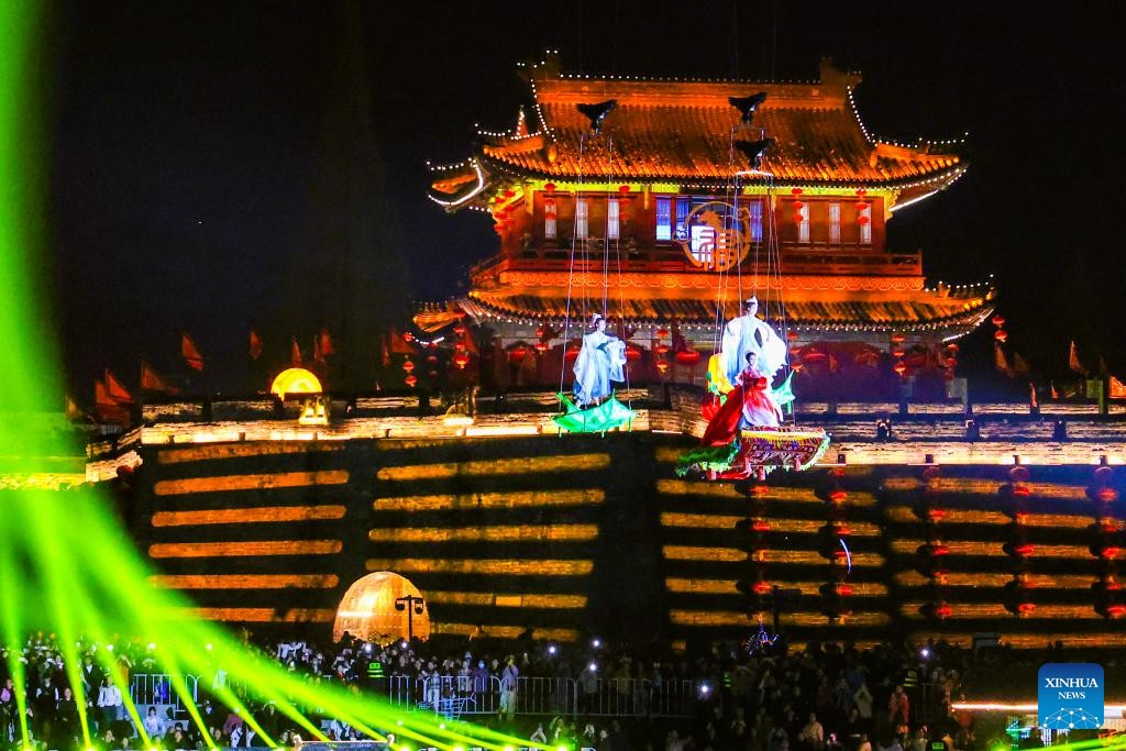 A performance is staged outside the Jingzhou ancient city in Jingzhou, central China's Hubei Province, April 3, 2026. The performance aiming at boosting spring cultural tourism was staged here on the evening of Friday, attracting lots of visitors. (Photo by Xiao Qi/Xinhua)