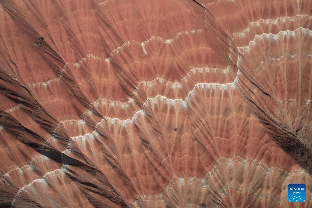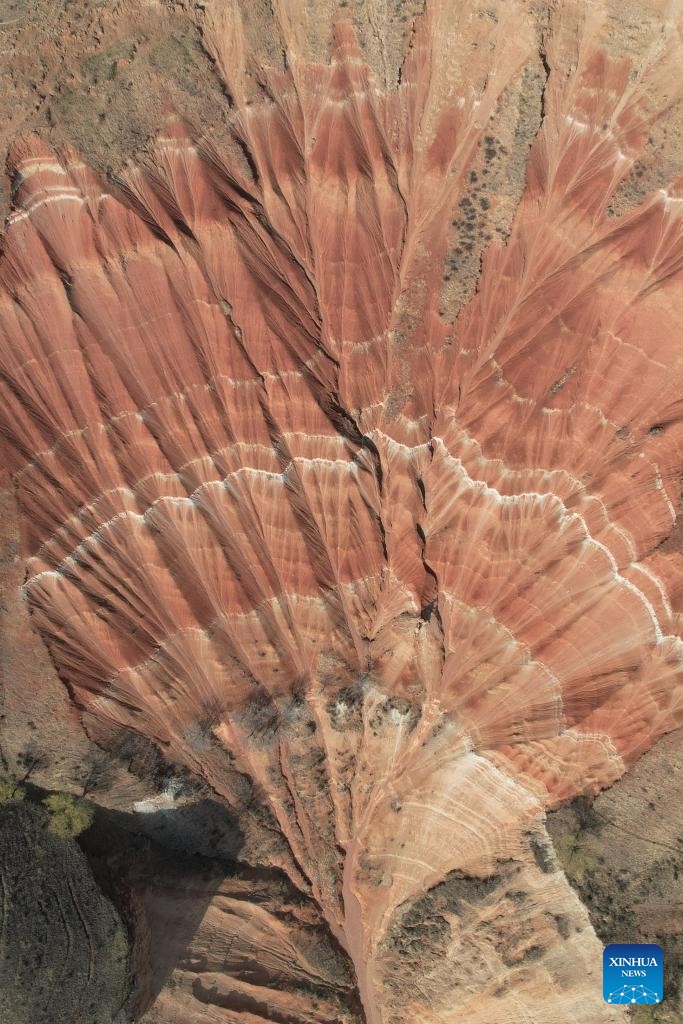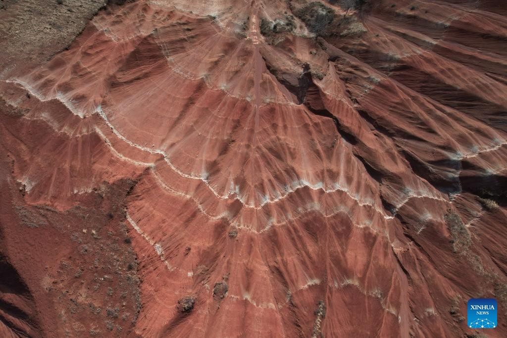 An aerial drone photo taken on April 3, 2026 shows a view of the Danxia Landform in Dongyuan Town of Dongxiang Autonomous County, Linxia Hui Autonomous Prefecture, northwest China's Gansu Province. (Xinhua/Zhang Zhimin)