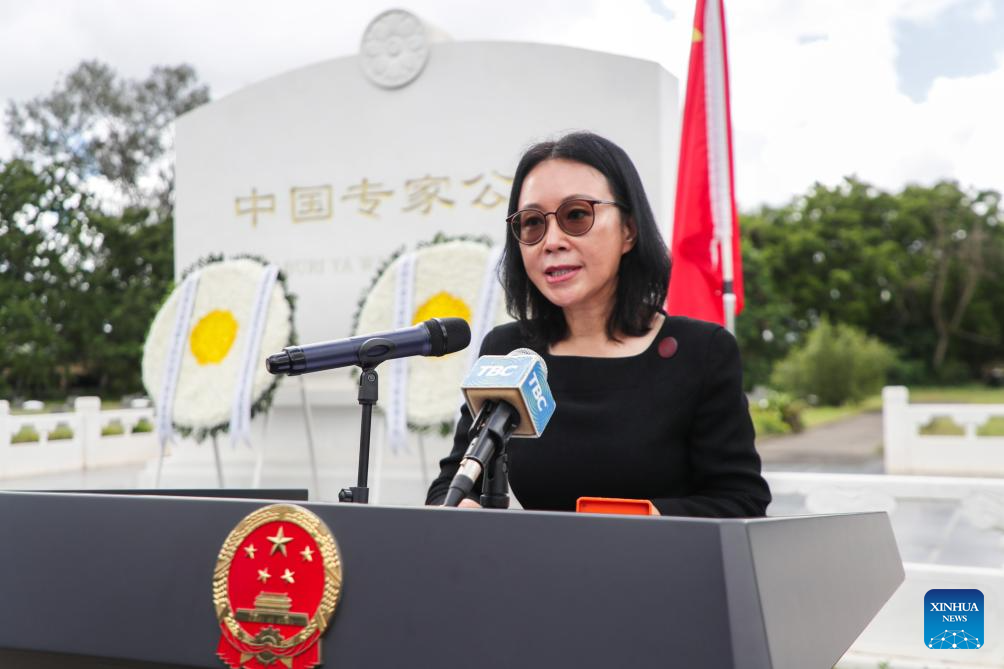 Chinese Ambassador to Tanzania Chen Mingjian delivers a speech during a joint commemoration at the Chinese Expert Cemetery in Dar es Salaam, Tanzania, on April 4, 2026.