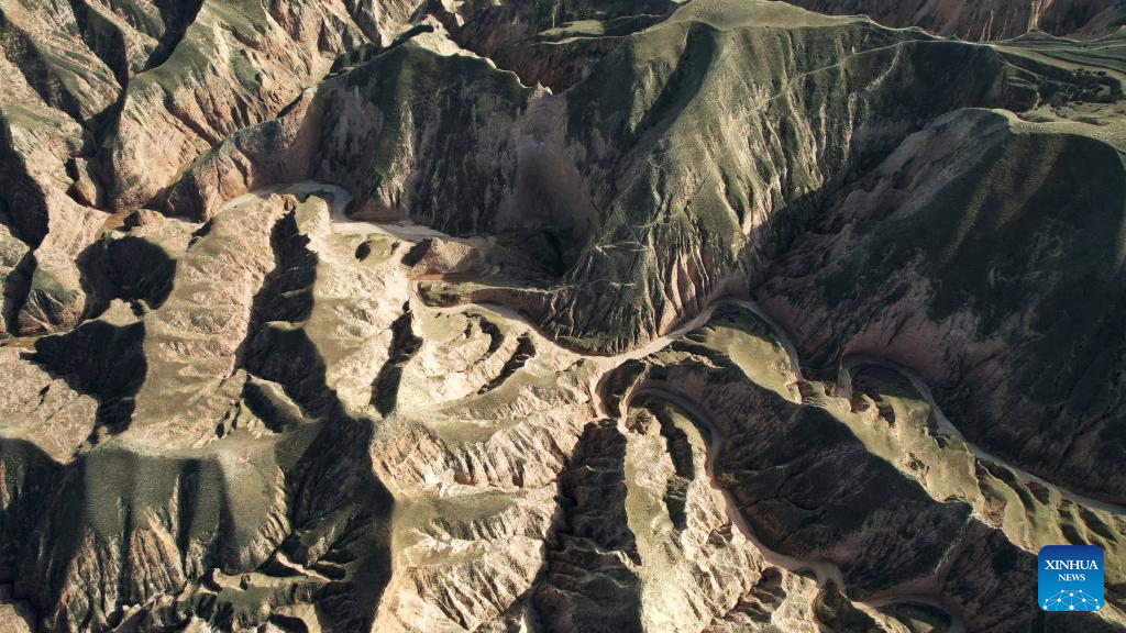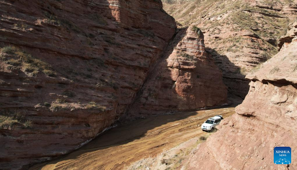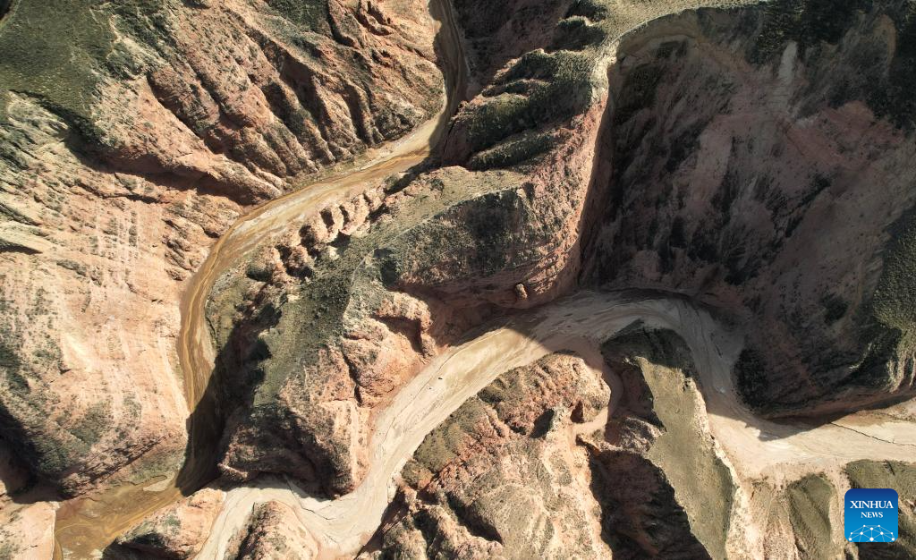 This aerial drone photo taken on April 4, 2026 shows a view of the Shilaquan Canyon in Tangwang Town of Dongxiang Autonomous County, Linxia Hui Autonomous Prefecture, northwest China's Gansu Province. Shilaquan Canyon has an average elevation of approximately 2,000 meters. The red sandstone and gravel layers on both sides of the canyon have been shaped by water erosion and wind abrasion, forming a distinctive Danxia landform. (Xinhua/Chen Bin)