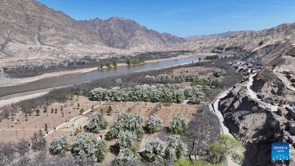 An aerial drone photo taken on April 6, 2026 shows pear trees in full bloom at Nanchangtan Village in Zhongwei, northwest China's Ningxia Hui Autonomous Region.