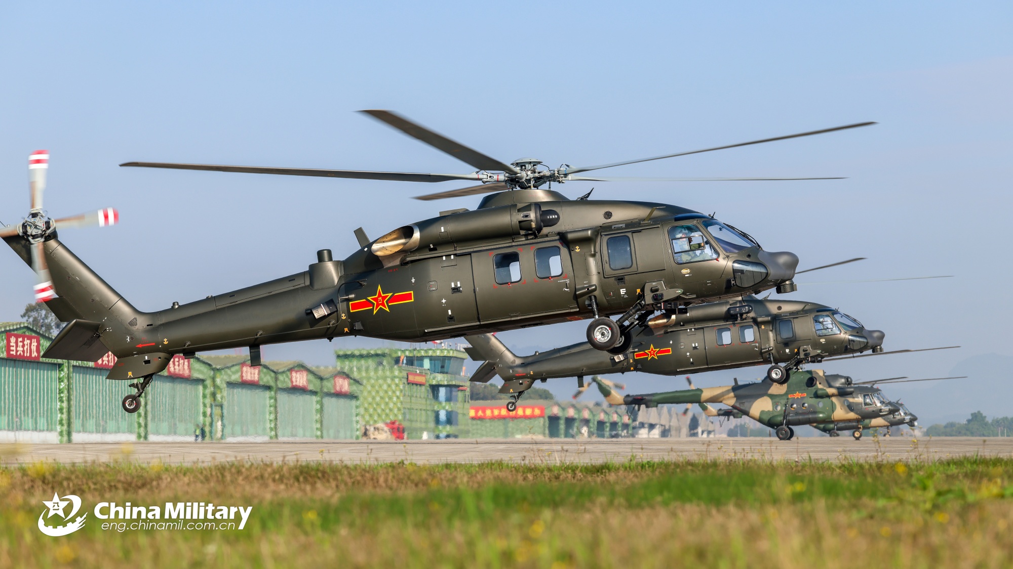 Multiple types of helicopters attached to a brigade under the Chinese PLA 76th Group Army take off during a round-the-clock training exercise. (eng.chinamil.com.cn/Photo by Li Xiaoxiao)