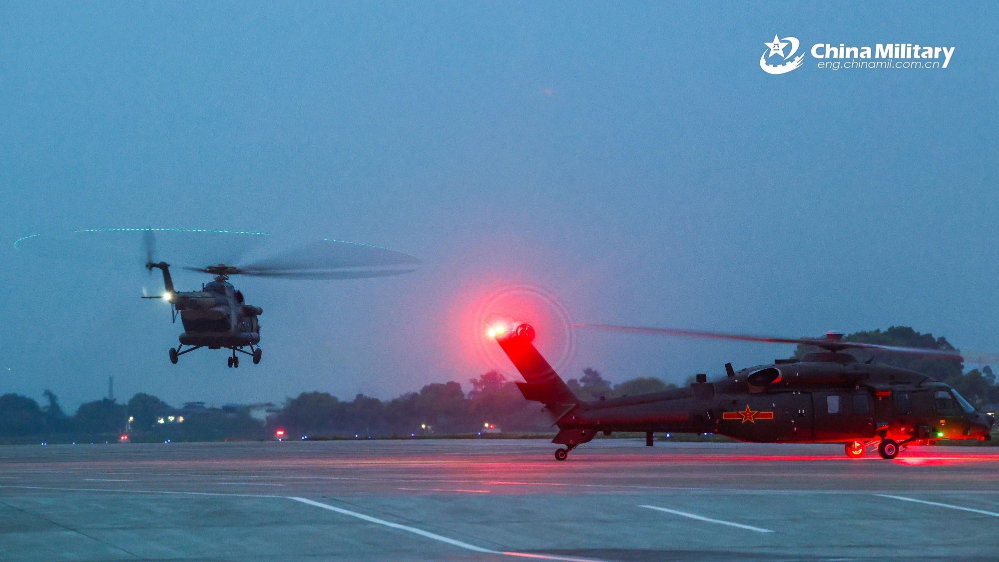 Multiple types of helicopters attached to a brigade under the Chinese PLA 76th Group Army take off for nighttime flight training during a round-the-clock training exercise. (eng.chinamil.com.cn/Photo by Yang Chenghao)