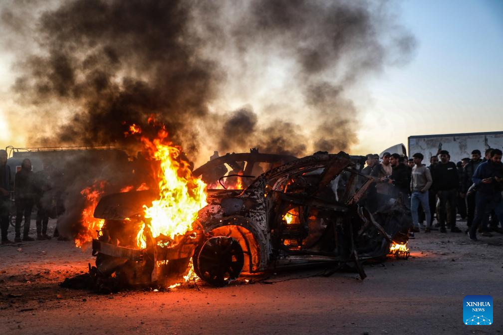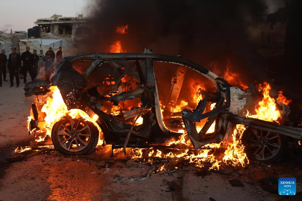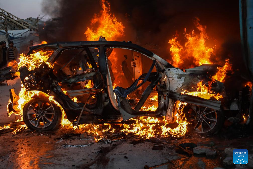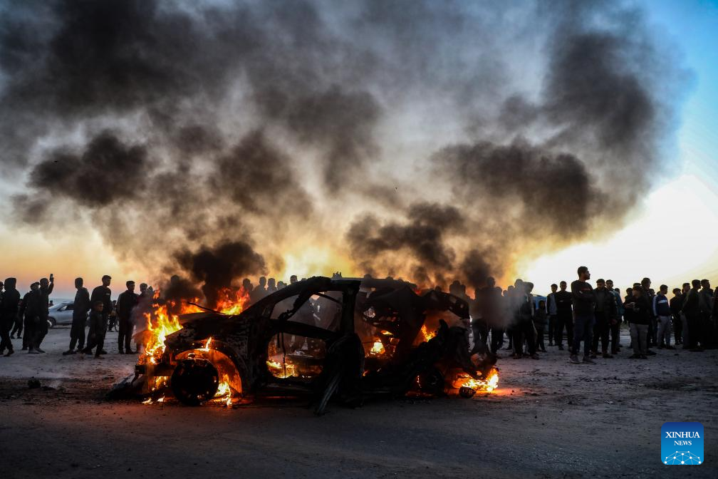 Photo taken on April 8, 2026 shows a vehicle burning after being hit by an Israeli airstrike in which an Al Jazeera journalist was killed, in Gaza City. Four Palestinians, including a journalist, were killed on Wednesday in two separate incidents of Israeli airstrikes on Gaza City, according to Palestinian security and medical sources. Palestinian security sources told Xinhua that one of the dead was journalist Mohammed Wishah, who worked for Al Jazeera Mubasher, a Doha-based public affairs television network. (Photo by Rizek Abdeljawad/Xinhua)