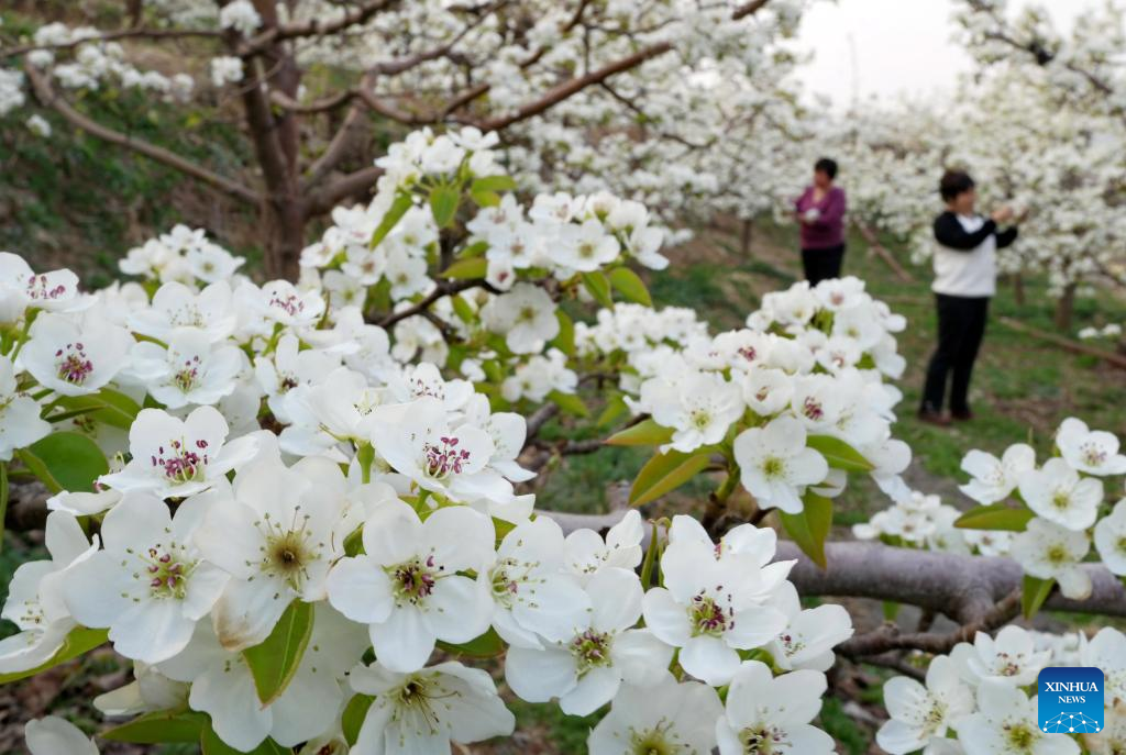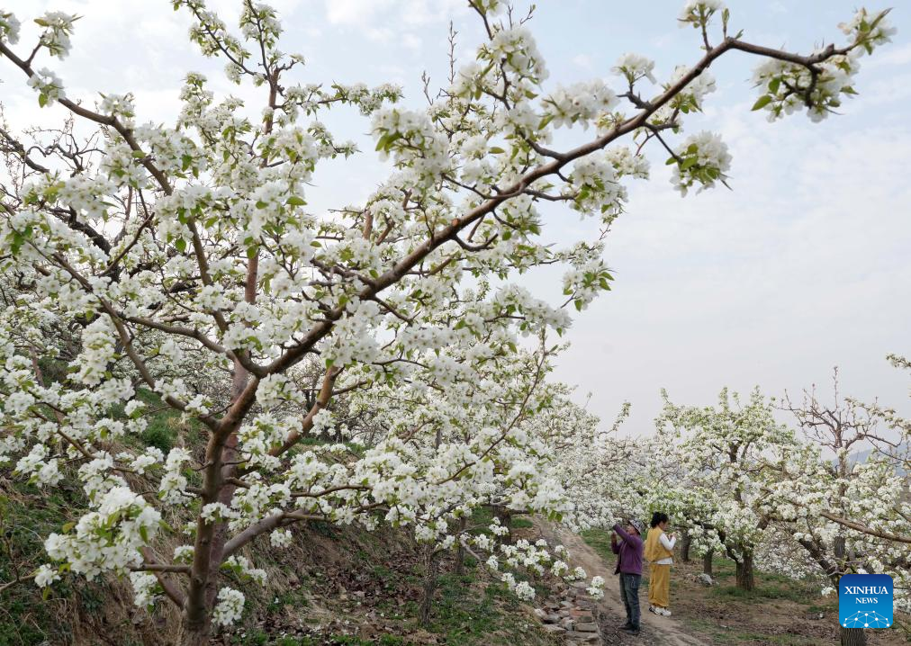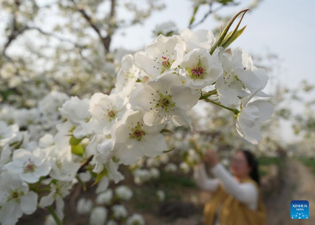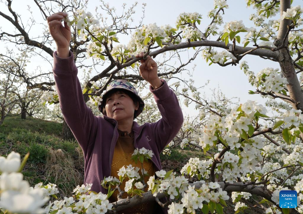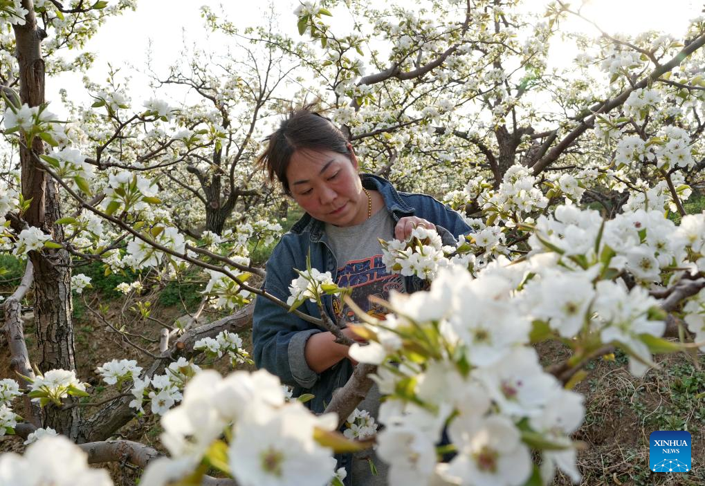 Farmers perform flower thinning, pollinating work as pear trees bloom in Hebei