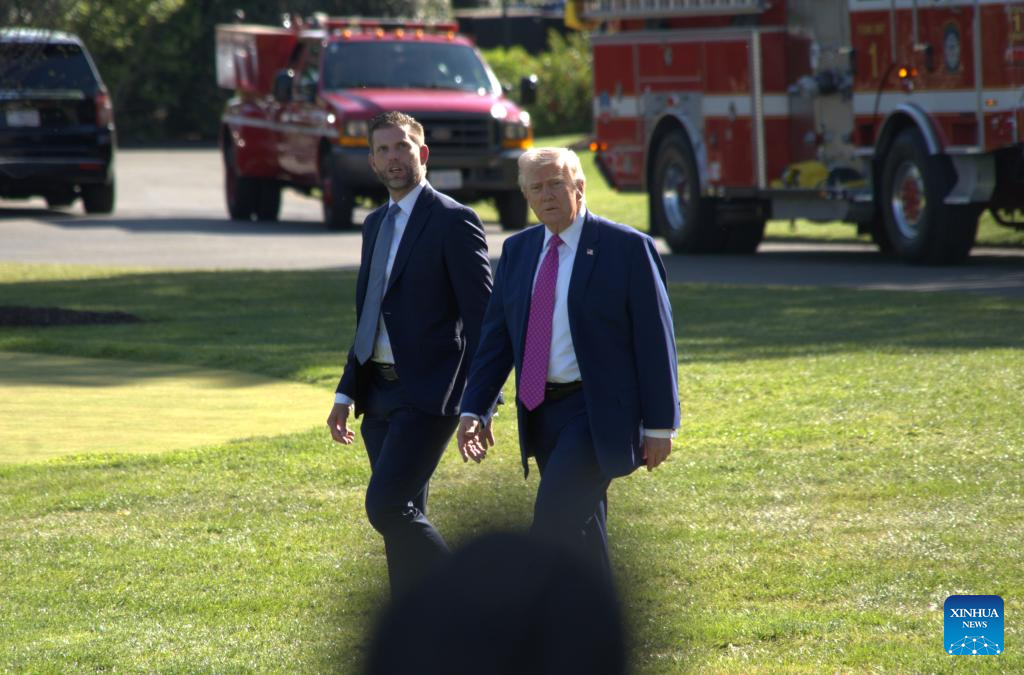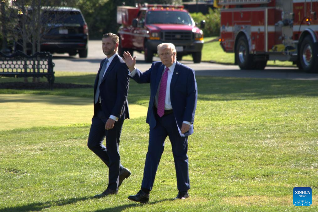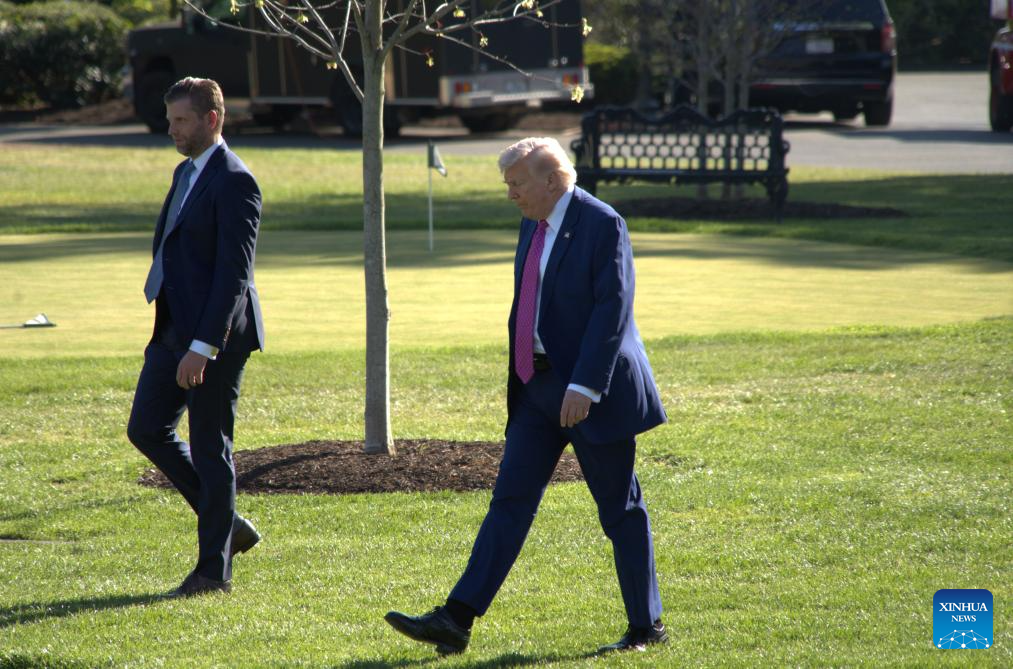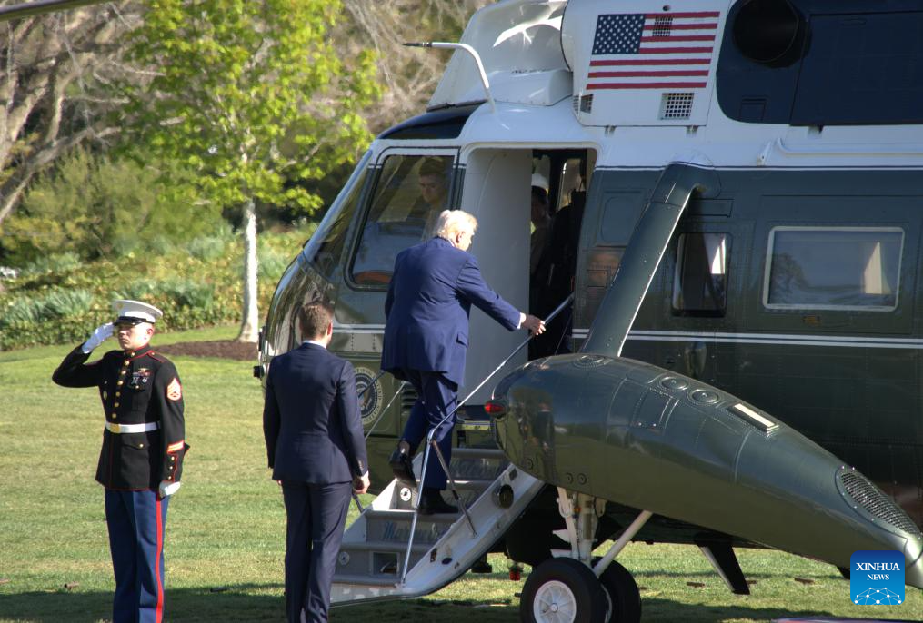 U.S. President Donald Trump (R) walks to board Marine One at the White House in Washington, D.C., the United States, on April 10, 2026. Trump said Friday U.S. negotiators will discuss the reopening of the Strait of Hormuz with the Iranians in Pakistan on Saturday, asserting the crucial global energy waterway will reopen soon and "automatically," with or without Iran's cooperation. Trump said his main focus in a deal with Iran was ensuring that Tehran cannot obtain a nuclear weapon. (Photo by Li Yuanqing/Xinhua)