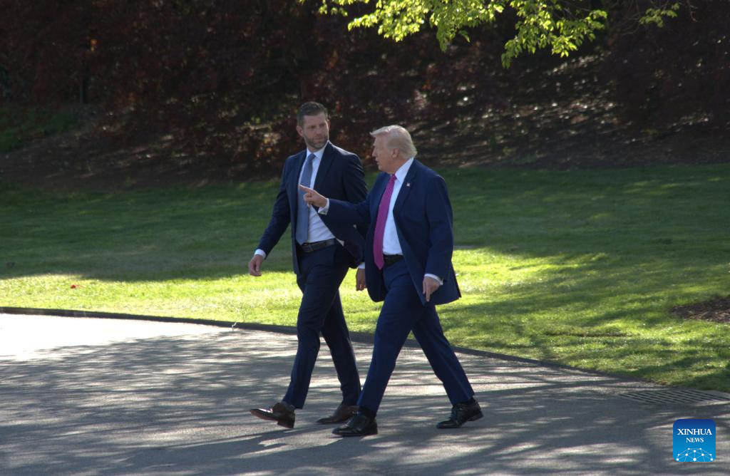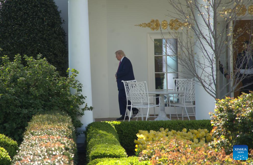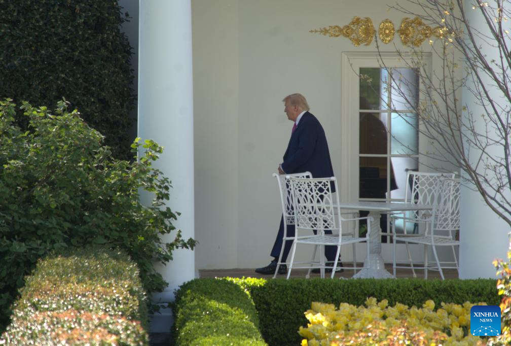 U.S. President Donald Trump walks toward Marine One at the White House in Washington, D.C., the United States, on April 10, 2026. Trump said Friday U.S. negotiators will discuss the reopening of the Strait of Hormuz with the Iranians in Pakistan on Saturday, asserting the crucial global energy waterway will reopen soon and "automatically," with or without Iran's cooperation.