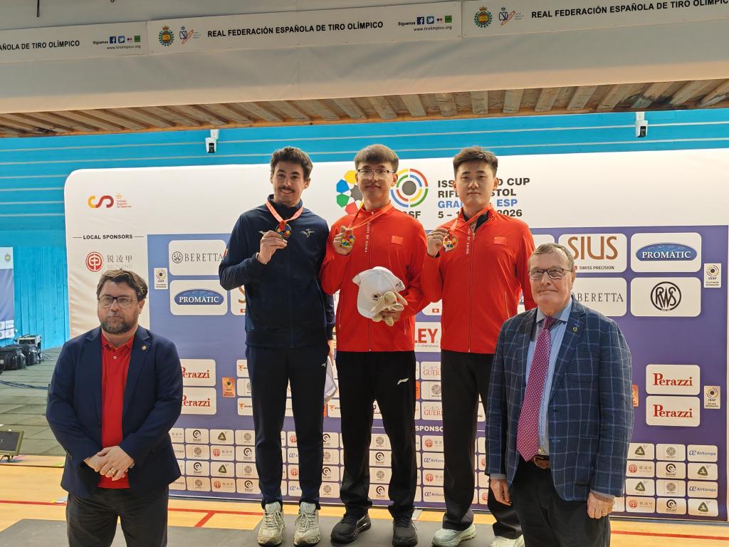 Zhang Changhong (C) and Liu Yukun (2nd R) pose on the podium after the men's 50-meter rifle 3 positions at the ISSF World Cup, in Granada, Spain, on April 12, 2026. (Photo/Xinhua)