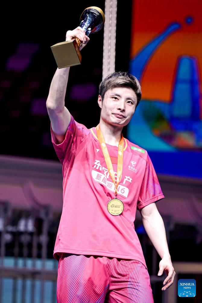 First-placed Shi Yuqi of China celebrates during the men's singles awarding ceremony at the Badminton Asia Championships 2026 in Ningbo, east China's Zhejiang Province, April 12, 2026. (Xinhua/Jiang Han)