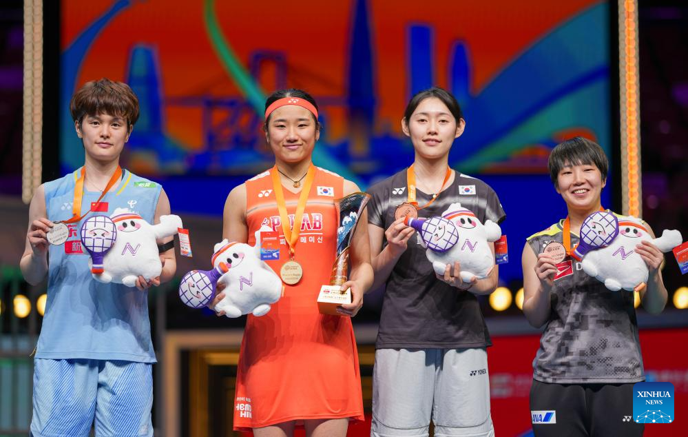 First-placed An Se Young (2nd L) of South Korea, second-placed Wang Zhiyi (1st L) of China, third-placed Sim Yu Jin (2nd R) of South Korea and Yamaguchi Akane of Japan pose for group photos during the women's singles awarding ceremony at the Badminton Asia Championships 2026 in Ningbo, east China's Zhejiang Province, April 12, 2026. (Xinhua/Sun Fei)