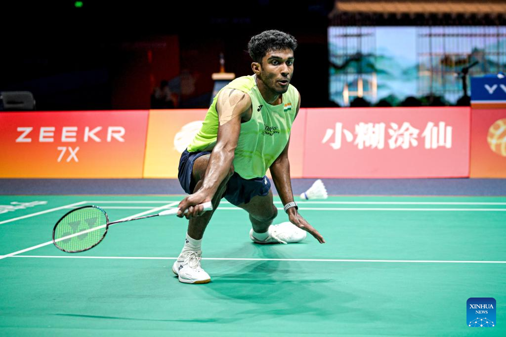 Ayush Shetty of India hits a return during the men's singles final against Shi Yuqi of China at the Badminton Asia Championships 2026 in Ningbo, east China's Zhejiang Province, April 12, 2026. (Xinhua/Jiang Han)