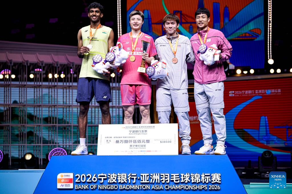 First-placed Shi Yuqi (2nd L) of China, second-placed Ayush Shetty (1st L) of India and third-placed Kunlavut Vitidsarn (2rd R) of Thailand and Chou Tien Chen of Chinese Taipei pose for group photos during the men's singles awarding ceremony at the Badminton Asia Championships 2026 in Ningbo, east China's Zhejiang Province, April 12, 2026. (Xinhua/Jiang Han)