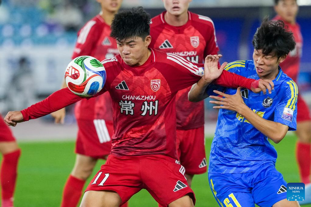 Zhang Xiangdong (3rd L) of Nantong competes during the opening match between Changzhou and Nantong of the 2026 Jiangsu Football City League in Changzhou, east China's Jiangsu Province, April 11, 2026. (Xinhua/Ji Chunpeng)