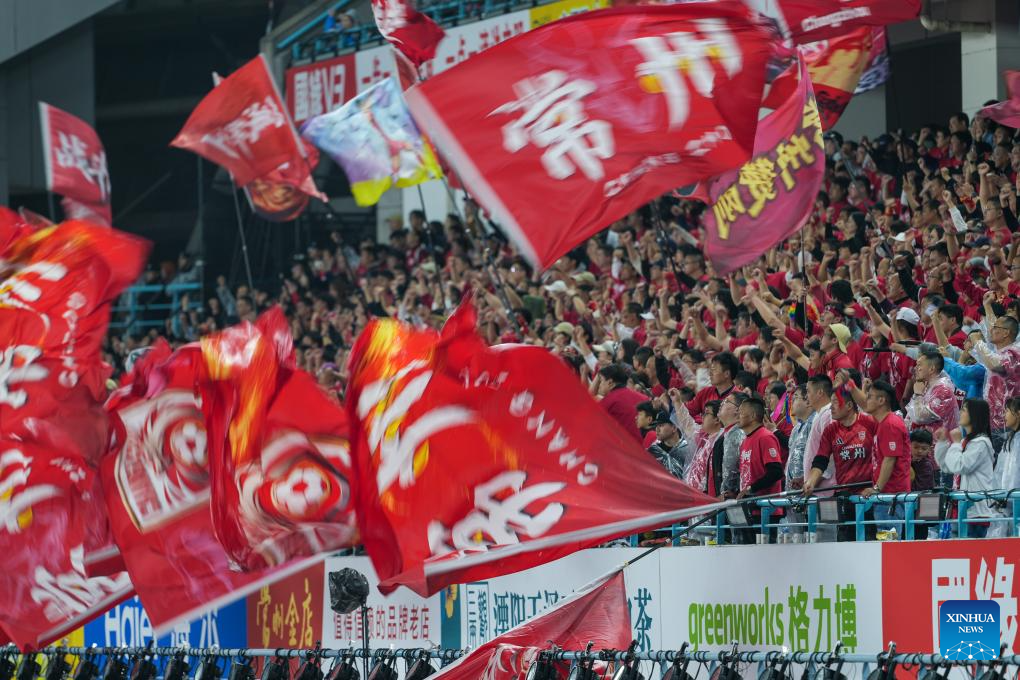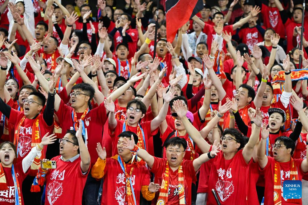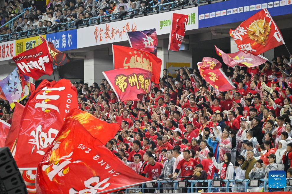 Supporters celebrate victory of Team Changzhou after the opening match between Changzhou and Nantong of the 2026 Jiangsu Football City League in Changzhou, east China's Jiangsu Province, April 11, 2026. (Xinhua/Ji Chunpeng)