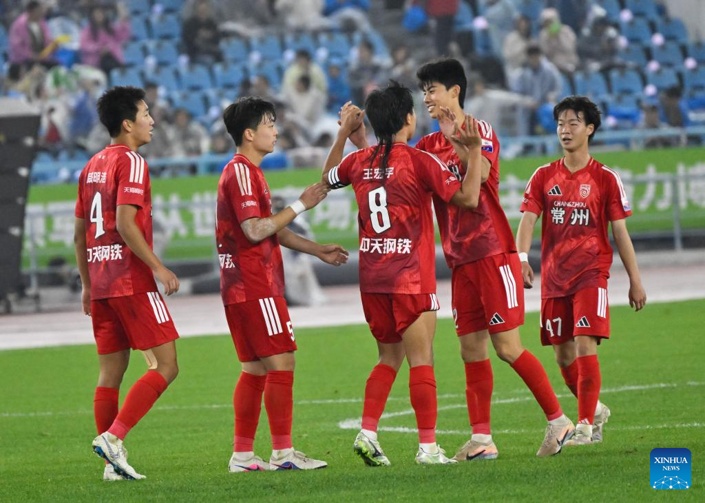 Players of Changzhou celebrate victory after the opening match between Changzhou and Nantong of the 2026 Jiangsu Football City League in Changzhou, east China's Jiangsu Province, April 11, 2026. (Xinhua/Li Bo)