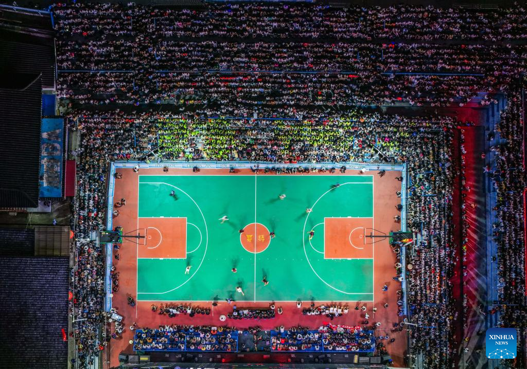 An aerial drone photo shows the basketball court of the final match between Kaili City and Yanhe County at the 2026 China's Village Basketball Competition in Taipan Village, Taijiang County, southwest China's Guizhou Province, April 11, 2026. (Xinhua/Yang Wenbin)
